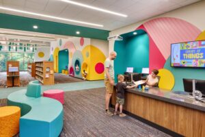 Lamar Johnson Collaborative_Clark Family Branch _Childrens Check Out: The colorful children’s area at the Clark Family Branch features reading nooks, a mini playhouse and interactive learning stations, inviting young minds to explore and discover. (Credit: Kim Rodgers)