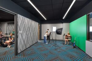 Lamar Johnson Collaborative_Clark Family Branch_Teen Area Studio: The library’s dedicated teen area is home to a recording studio, green screen, 3D printer, design lab and flexible spaces for group study and creative collaboration. (Credit: Kim Rodgers)