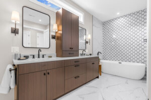 Wolfram Collection_Primary Bathroom: Primary bathrooms in the Wolfram Collection come equipped with double-sink vanities, double showers, a bidet and free-standing soaking tub. (Credit Baird & Warner)
