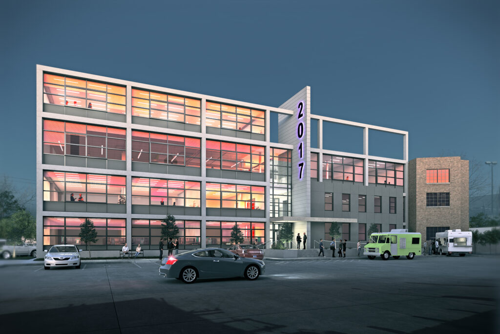 Customizable spaces at 2017 N. Mendell range from 3,800 to 17,000 square feet. Aligning with emerging workplace trends, Baker Development incorporated high-tech design features like electrochromatic glass windows, a 3,000-square-foot rooftop deck overlooking the adjacent river and downtown skyline, and a dedicated food truck court. The building has 50 on-site parking spaces in addition to the more than 100 spaces available on Mendell Street.