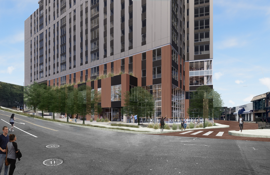 When completed, the development at the intersection of Garner Street and Beaver Avenue will include 227 apartments with a total of 734 beds, located on floors three through 12, and 30,000 square feet of retail on the two lower levels. The retail, inspired by a European arcade, will surround a new public courtyard with seating and a grand staircase.