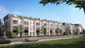 MI Homes_Benton+Main_Exterior Rendering: Benton + Main will include 11 townhomes featuring four-story designs with three to four bedrooms, private rooftop terraces and rear-entrance two-car garages.