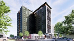 Chapter Alder Exterior Rendering: CRG has started construction on Chapter Alder, a 15-story, 491-bed student housing community adjacent to the University of Oregon campus.