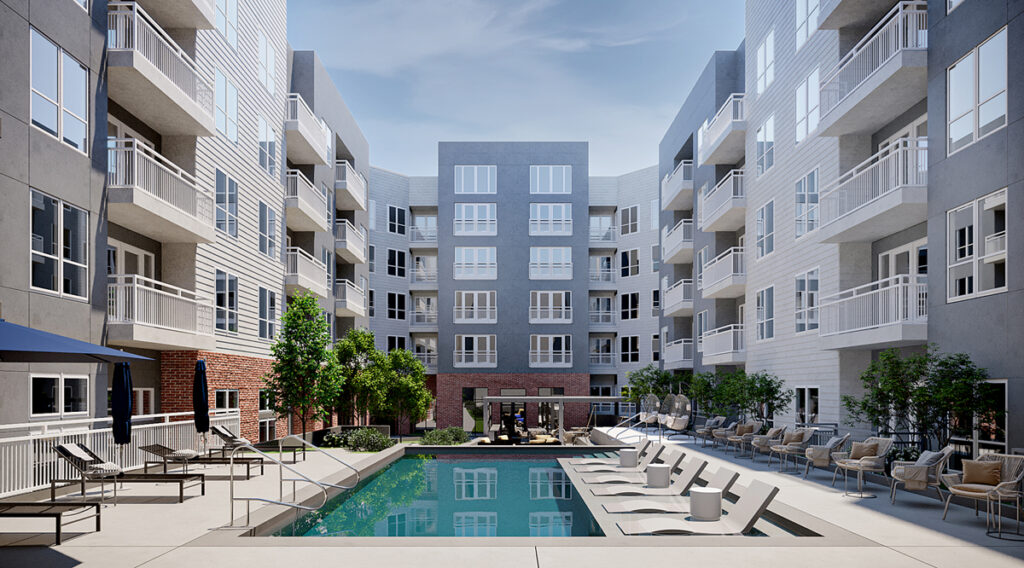 Outdoor recreational amenities include a landscaped courtyard and sun deck with an infinity-edged swimming pool, in-pool loungers, grilling stations, dining areas, fire pit and terrace seating. Additional resident amenities include secure bike storage and a five-story, 93,000-square-foot parking garage that features a 5,000-square-foot mural created by North Texas artist Eric ‘Drigo’ Rodriguez.