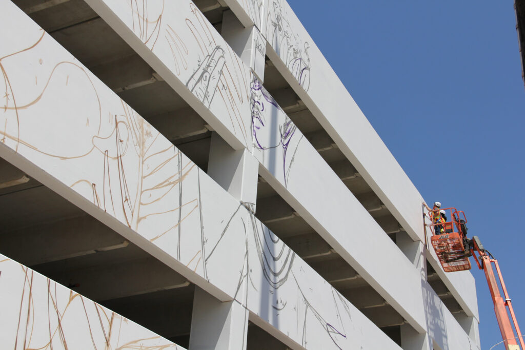 Drigo, a native of McKinney, Texas, has been painting for eight years. His figurative contemporary mural at Broadway Chapter depicts a colorful scene with tropical imagery that spans five massive concrete panels. Over a months-long time span, Drigo completed all of the work by hand — from priming the concrete panels, to sketching the large-scale work using a meticulous grid system, to painting the intricate design — using a mechanical lift supplied by CRG.