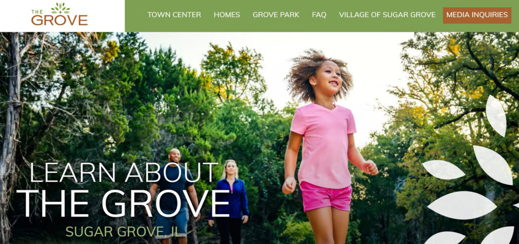 The current plan for The Grove would position the town center, community green space and residential neighborhoods on the land parcel south of Interstate 88, along with a smaller live/work district – Grove Park – on the land parcel north of the interchange. Grove Park could feature a variety of land uses, including healthcare, business suites, retail, restaurants, multifamily housing, distribution, data center, and other services that provide job opportunities and benefit the Sugar Grove community.