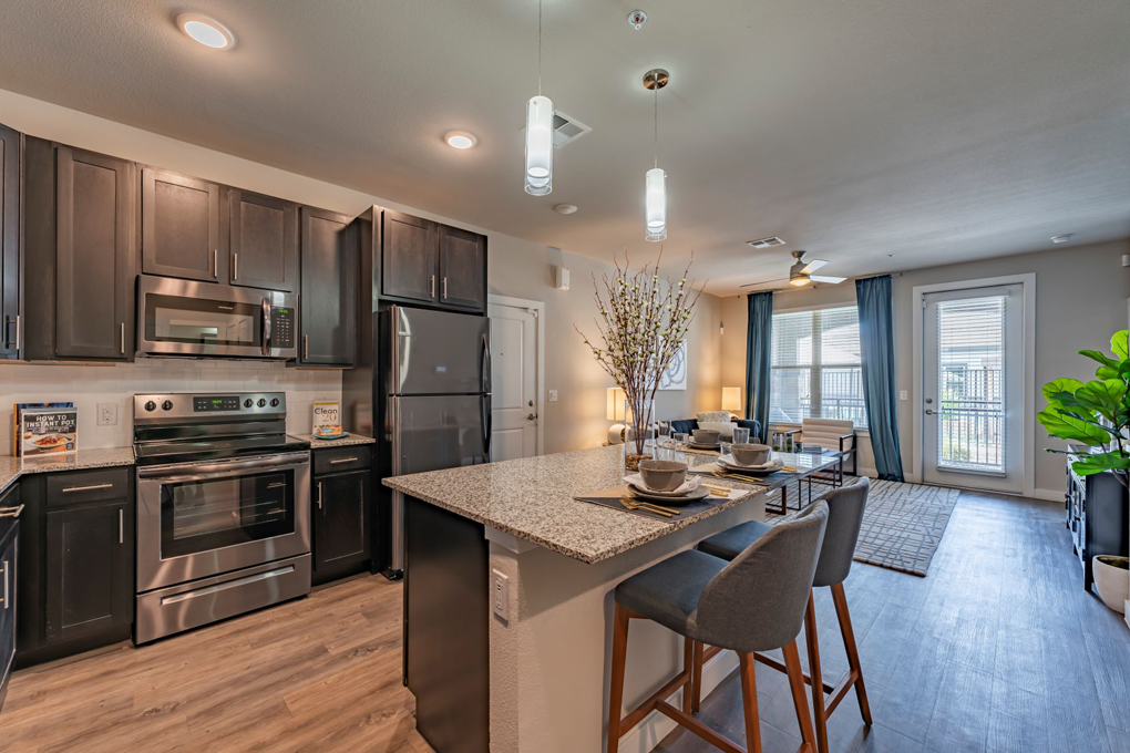 Senita on Cave Creek_Interior:Senita on Cave Creek’s mix of 1-, 2- and 3-bedroom apartments offer 10 floor plans and feature open layouts, gourmet kitchens, vaulted ceilings with crown molding and hardwood-style flooring.