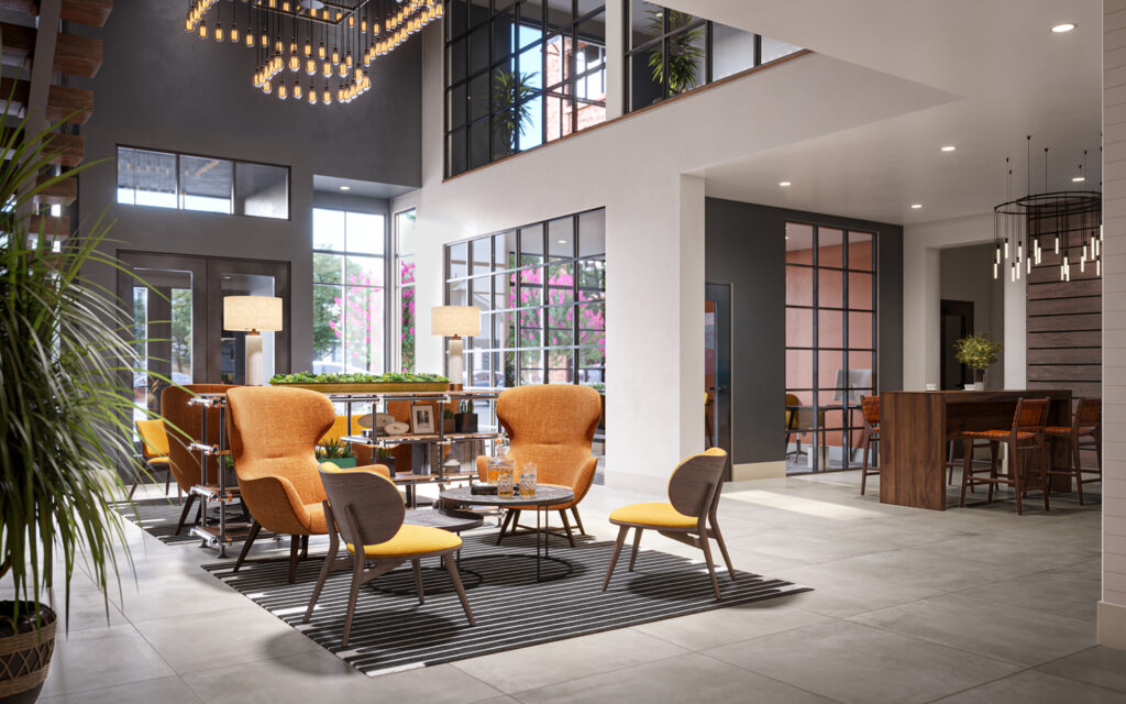 Moda at the Hill_Lobby_Rendering: Amenities at Moda, which are centered around the lobby to create a lively, hospitality-style atmosphere, include community lounges for gathering and socialization, a fitness center with yoga studio, resident game room, coworking spaces and pet care facilities.