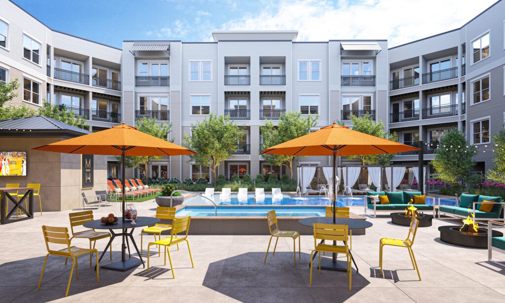 Moda at the Hill_Courtyard_Rendering:Outdoor amenities at Moda include a large, landscaped courtyard with a resort-style pool and hot tub, as well as cabanas, grilling stations, fire pits and on-site pet park.