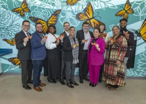 Encuentro Square Apartments Mural: Elected officials and partners of Encuentro Square Apartments stand in front of a new mural in the 3759 W. Cortland building, one of two buildings comprising Encuentro Square Apartments in Chicago’s Logan Square neighborhood. The mural, which depicts monarch butterflies and is visible from the street, was created by two local Chicago artists, Natalia Virafuentes and Naomi Martinez, and coordinated by Palenque LSNA, a local neighborhood association.