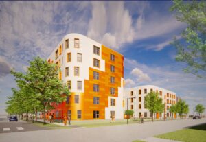 Encuentro Square Apartments Cortland Building Rendering: Encuentro Square Apartments is a two-building affordable housing development that includes this building at 3759 W. Cortland St. in Chicago’s Logan Square neighborhood. The community offers one-, two- and three-bedroom floor plans, along with a host of on-site amenities and community support services for residents. (Credit: Canopy / architecture + design)