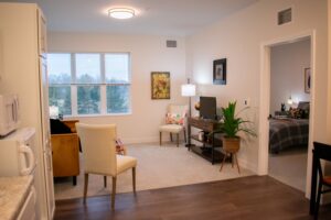 Green Oaks of Goshen Apartment Interior: Evergreen Real Estate Group recently completed Green Oaks of Goshen, a four-story, 120-unit assisted living community for low-income seniors in Goshen, Ind. The community offers 49 studio and 71 one-bedroom apartments, all of which are reserved for seniors age 62 or older, with incomes at or below 80% of the area median income (AMI).
