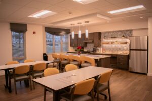 Green Oaks of Goshen Community Room: Among the many on-site amenities offered at Green Oaks of Goshen, a new 120-unit assisted living community for low-income seniors in Goshen, Ind., is a community room with kitchen and seating areas.