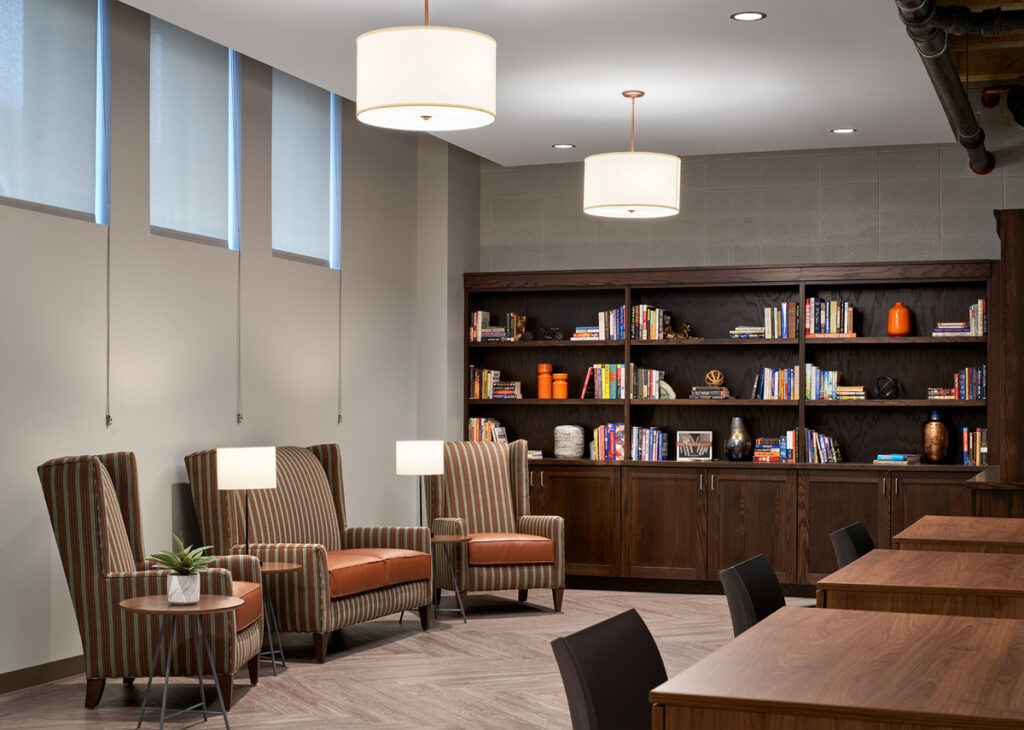 Structural changes to the former hospital include the addition of an elevator and staircase at the entrance of the independent living community to improve accessibility for residents and guests. Other improvements include new window openings, updated mechanical systems and modernized elevators. Both the independent and supportive living communities share the existing parking garage, which also is utilized by Lycée Français de Chicago and other commercial and residential buildings on the block.