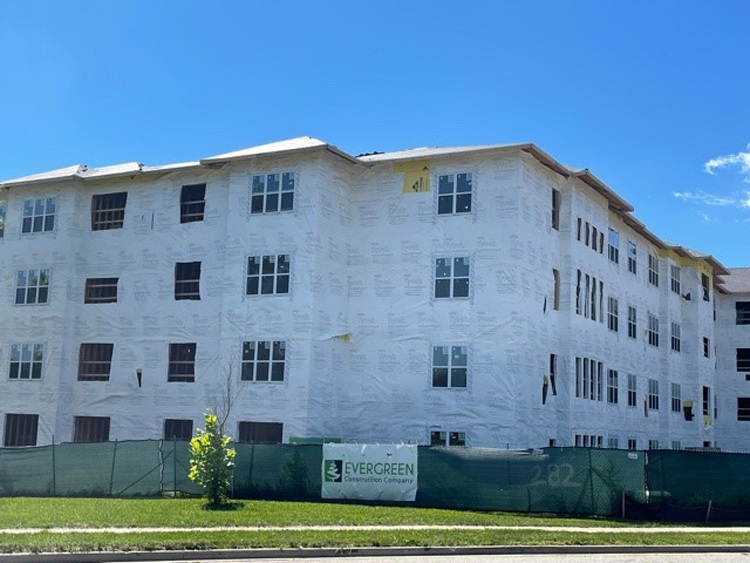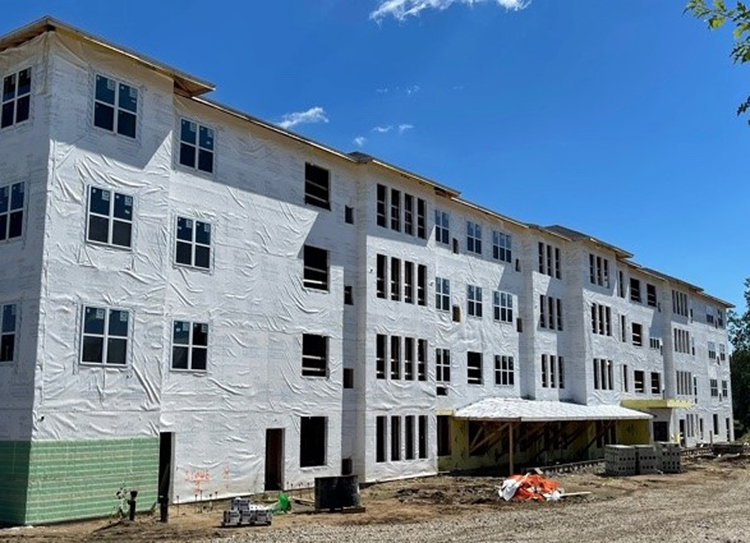 Evergreen Construction Company has completed the wood-frame structure, including the building enclosure and framing supports, bringing it to its full height of four stories. The construction crew is currently installing windows and façade finishes, including fiber cement siding and stone veneer, which will be followed by the installation of mechanical, electrical, plumbing and fire protection rough-ins.