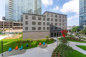 The Seng is one of three residential buildings totaling 487 units to be completed at Wendelin Park, a mixed-use, mixed-income development by Structured Development on a site bounded by Blackhawk, Dayton and Kingsbury streets, on Chicago’s Near North Side. The other properties include Post Chicago, a newly opened 10-story, 431-bed co-living community operated by Tripalink, and Foundry, a 27-story, 327-unit market-rate rental tower scheduled for completion in early 2024. All three residential buildings are centered around the new 26,000-square-foot Wendelin Park, privately developed by Structured as a public amenity featuring a nature play area, dog run, community garden and 20-foot sculpture from Chicago artist Ruth Aizuss Migdal, titled “Red Tree Uprising,” commissioned through the Chicago Sculpture Exhibit.