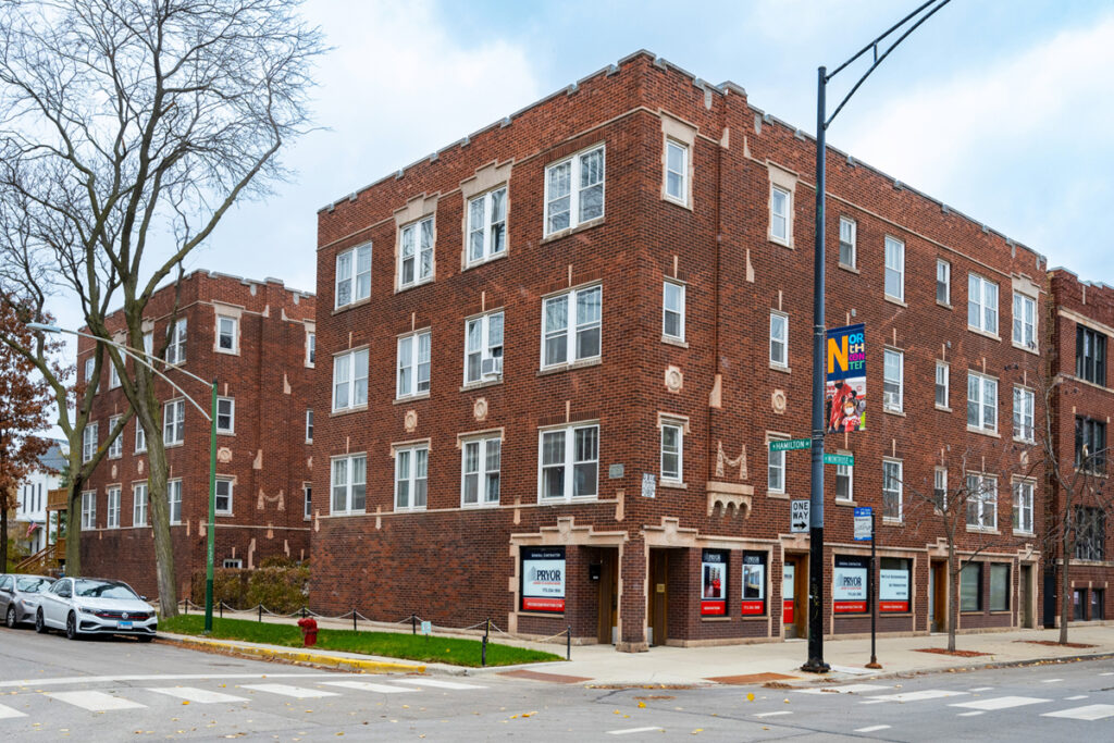 Located at 4401-11 N. Hamilton Ave., the courtyard building features 12 studios and 12 one-bedroom units, as well as three commercial spaces. Constructed in 1927, it has undergone recent capital improvements that included updates to the building envelope and systems.