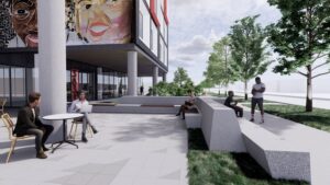 LJC_Humboldt Park Passive Living Rendering 1: An example of the many cutouts to the block-long, mixed-use building, Humboldt Park Passive Living’s corner entrance will have floor-to-ceiling windows overlooking a sheltered gathering area.