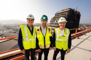 Habitat Topping-Out Leadership: Pictured left to right: Jeff Pion, Vice Chairman, CBRE; Ryan Burton, Director of Development and Senior Vice President, Lendlease; Glen Rosic, Vice President, Senior Development Manager, Lendlease. Credit: Kyle Espeleta
