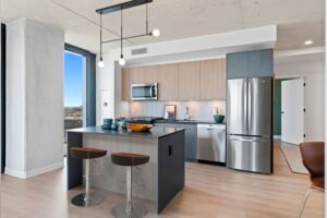 The indoor amenities extend to the building’s lobby, which includes a fireplace, hospitality-style bar and variety of seating configurations for remote work and small social gatherings. This first-floor space also includes a 24-hour concierge, mailroom and separate package room, and bicycle storage. Garage parking includes 13 spaces equipped with electric vehicle charging stations.