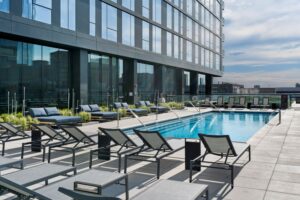 Outdoor amenities take advantage of The Reed’s riverfront location at the southern boundary of Southbank Park, a 2-acre green space developed and maintained by Lendlease as an amenity for both residents and neighbors in the surrounding community. Located on the eighth floor overlooking the park and Chicago River, the 15,000-square-foot amenity deck includes a pool, cabanas, sunning lawn, fire pits, open-air fitness area, and outdoor kitchens and dining areas for entertaining.