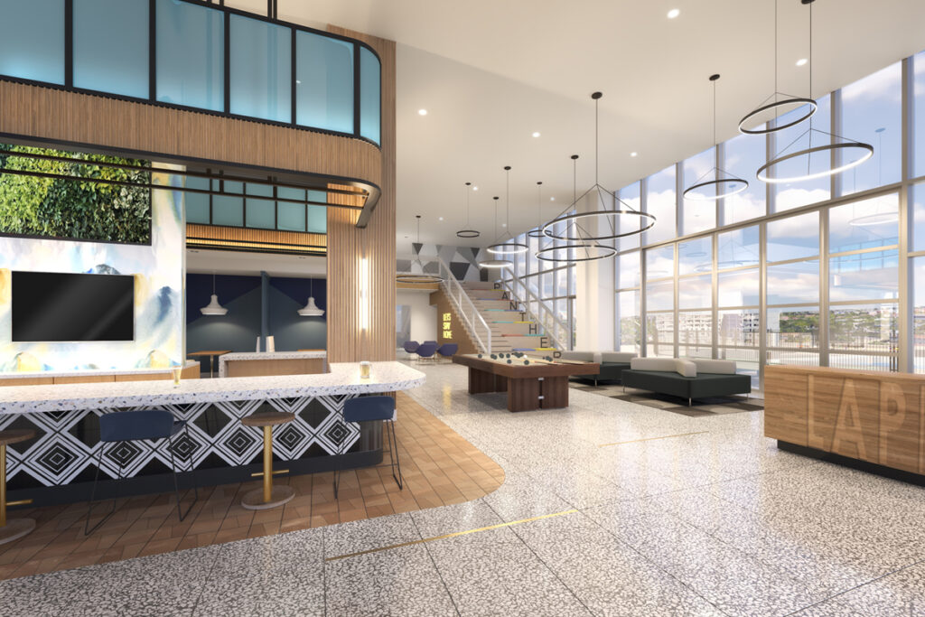Interior common spaces will feature an aesthetic rooted in the fundamentals of Latin-inspired design – bold use of color, a strong graphic presence utilizing distinct pattern and texture, and a memorable, fully curated art package. Rich blues ground the color palette — paying homage to the building’s name, Lapis, which is a highly sought-after celestial blue stone known as a universal symbol of wisdom and truth.