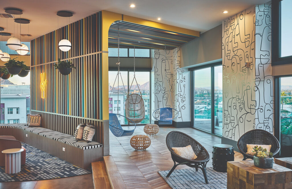 Mary Cook Associates_CANVAS_7th Floor Hammock Lounge: MCA’s design for CANVAS includes a variety of inviting spaces for socialization and relaxation such as this hammock lounge area on the 7th floor.