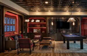 Remy_R Lounge: The speakeasy-inspired ‘R Lounge’ at Remy exudes vintage allure with a billiards table and bold splashes of red. (Credit: Interiors by Mary Cook Associates, developed by Toll Brothers Apartment Living and Equity Residential)