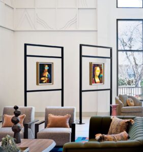 The Sadie_Artist Gallery: MCA designed custom transparent partitions for The Sadie that double as rotating mini galleries for artwork in the community’s lobby and combination mailroom and lounge space. (Credit: Interiors by Mary Cook Associates, developed by Toll Brothers Apartment Living and Equity Residential)
