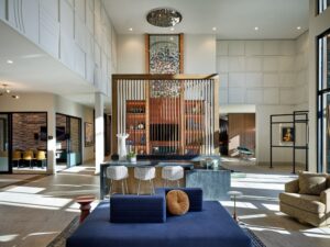 The Sadie_Lobby: The Sadie’s lobby sets the tone for the property’s gallery-like aesthetic with layered textures and pops of color from its curated furniture, fixtures and artwork. (Credit: Interiors by Mary Cook Associates, developed by Toll Brothers Apartment Living and Equity Residential)