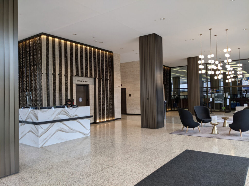 Orrington Plaza Lobby: McHugh Construction has completed renovation work for Golub & Company at Orrington Plaza, Evanston, Ill.’s tallest office building, which included installing a new reception desk and custom metal fins around the elevator core.