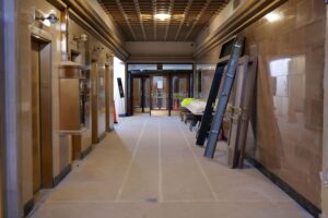 Elevator Lobby: McHugh Construction is carefully protecting and preserving the historic ground-floor elevator lobby at 65 E. Wacker Place while undertaking the office-to-residential conversion of the 1928 art deco tower.