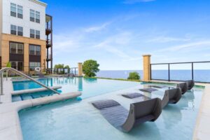 42 Hundred on the Lake Infinity Pool: Among the many resort-style amenities at 42 Hundred on the Lake in St. Francis, Wis., is an infinity edge pool surrounded by sun shelves and cabanas, which overlooks Lake Michigan.