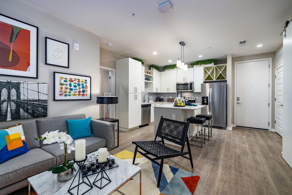 JadeNorthHydePark_Living Room and Kitchen_Wingspan Development Group: Jade offers a mix of studio, one-, two-, three- and four-bedroom apartments ranging from 463 to 1,421 square feet.