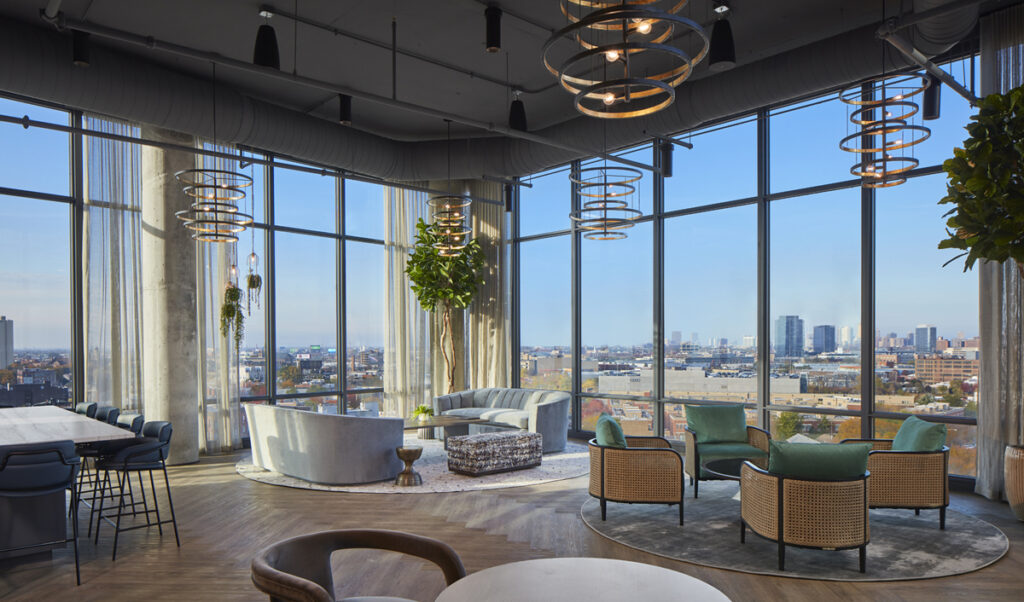 For the penthouse-level party room, MWA continued the idea of “urban oasis” with conservatory-inspired elements such as cane back chairs, globe light pendants, light-toned wood flooring, and ample foliage including potted trees, hanging planters and wall-mounted ledges filled with a variety of plants. “With the double-height expanses of windows and wonderful light in this space, we saw an opportunity to make it a true escape, contrasting the views of the city with all of these warm, natural elements and greenery,” said Tyler. “It’s also another example of a multi-purpose amenity space, whether residents use it for an evening gathering of friends around the huge kitchen island, a quiet area with a great background to take a Zoom call, or simply a beautiful room to relax in with a good book while they enjoy sweeping views of the city – all the way to Lake Michigan.”