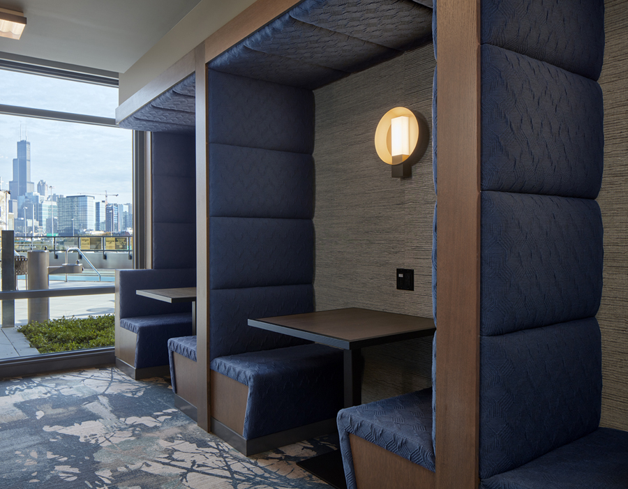 “Westerly reflects the next generation of coworking spaces in that we’ve extended those opportunities throughout the building, as residents want to get out of their apartments and work in a variety of different environments,” said Lindsey Senn, executive vice president at Fifield Cos. “The team at Morgante Wilson helped us create numerous inviting areas where residents can set up with a laptop. There’s a dedicated coworking space with sound-absorbing individual booths plus a dedicated conference room to give people a bit of privacy. These offerings are enhanced by the multiple seating configurations throughout the lobby, resident lounge and party room, and even a bar-height counter with seating along the windows in the mailroom where people can stop and return emails as they come and go throughout the day.”