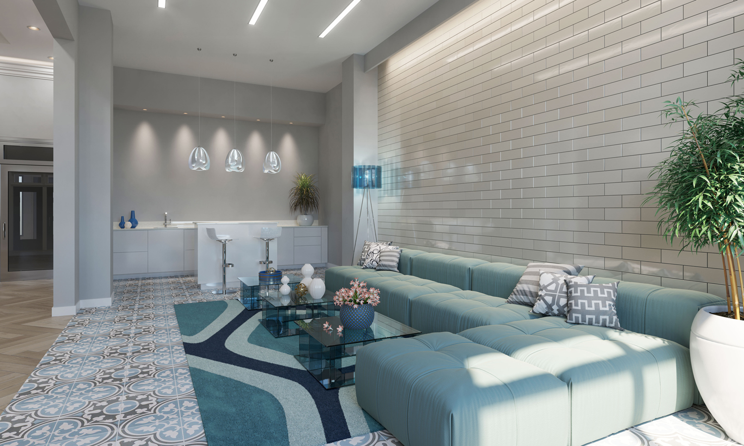 The building’s gracious two-level lobby features a striking Ann Sacks tile floor designed to welcome residents and guests with an aesthetic that speaks volumes about this exclusive community, according to Rossi.