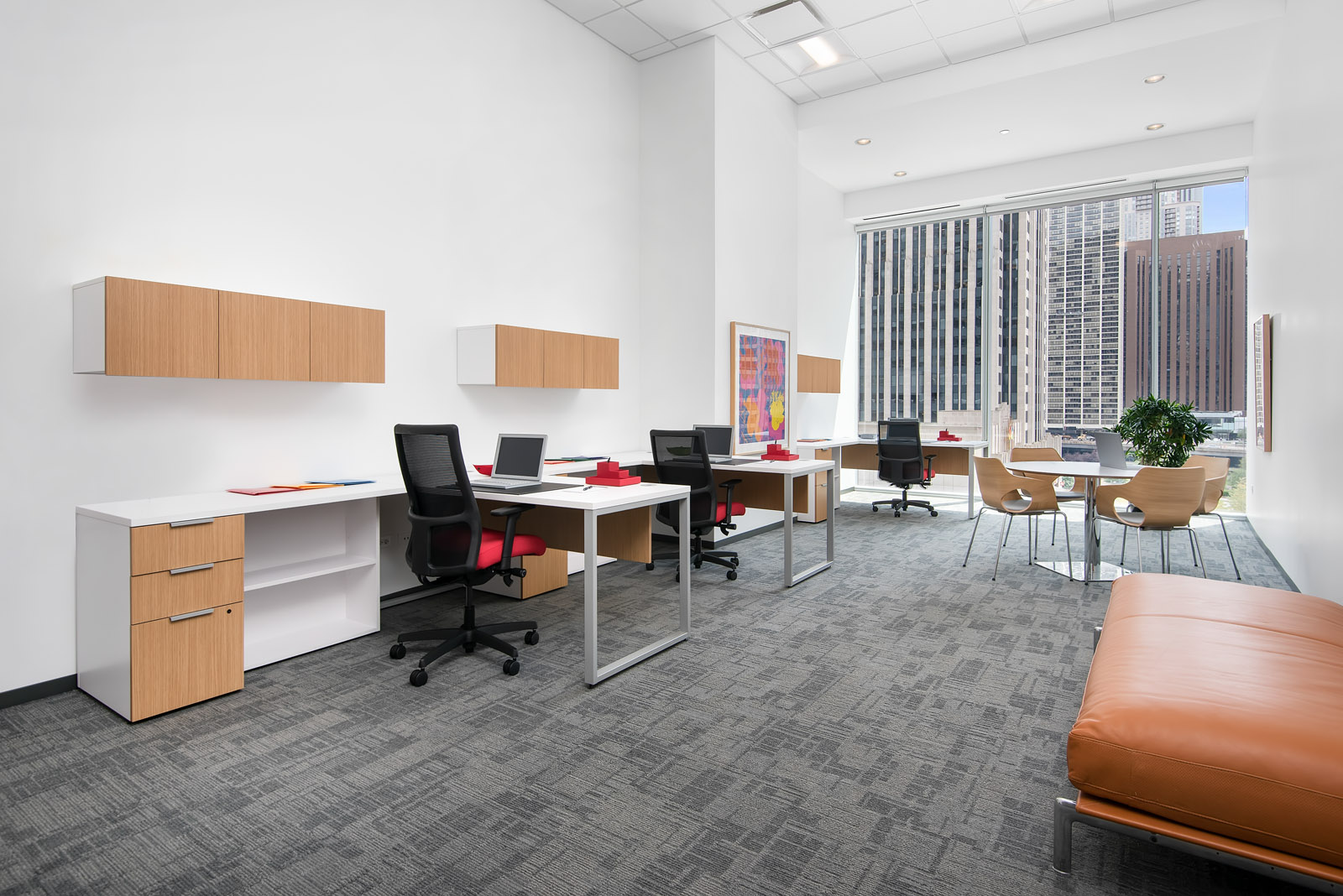 Furnished suites include a desk(s), lighting, mini-fridge, built-in cabinetry and window treatments. Select suites also have round conference desks with chairs for team meetings in addition to the work stations. Business suite users have free Wi-Fi and access to a shared kitchen and dining area. Rent ranges from $1,000 to $2,400 per month.