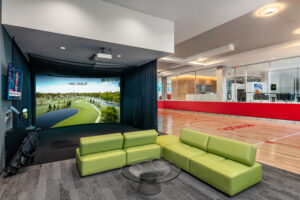 Optima Verdana_Indoor Pickleball/Basketball Court and Sports Lounge: Active amenities at Optima Verdana® include a fitness center, an indoor pickleball/basketball court and an adjacent sports lounge with golf simulator. (Credit Michael Duerinckx)