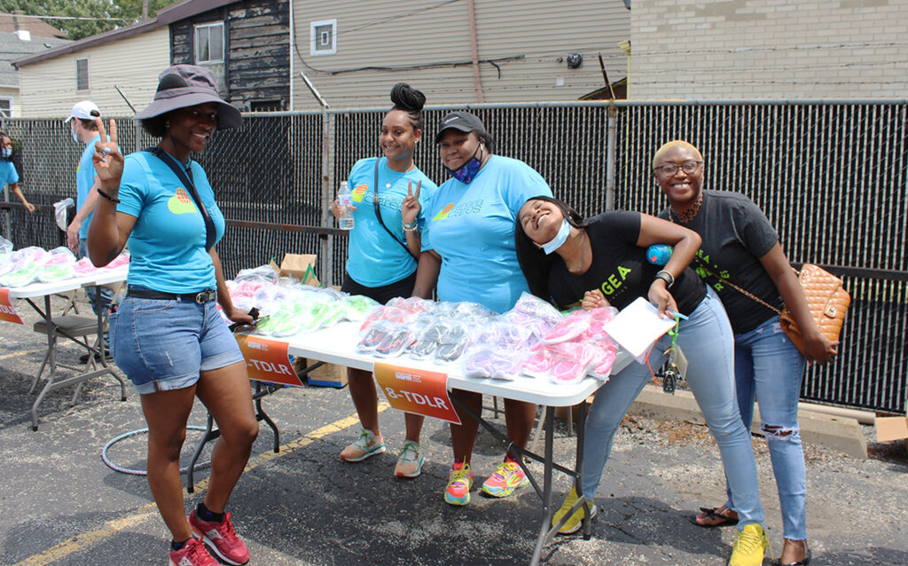 On Wednesday July 28th, 20 Pangea volunteers gathered at the parking lot of the SGA Youth & Family Services center at 3152 W. 47th St. in Chicago. Families with toddlers and young children picked up brand-new shoes and received a swag bag from Pangea with fun items for the children like bubbles, hacky sacks and sunglasses. While waiting to pick out shoes, volunteers played games with the children like hopscotch and ring toss and led a fun card game for larger prizes.