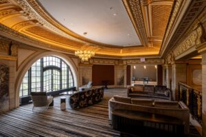The Belden-Stratford_Lobby: Today, the Belden-Stratford’s ornate double-height lobby features restored original elements such as gilded plaster molding and gold-leaf detailing. (Credit: Nicholas James Photography)