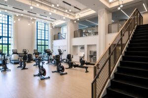 The Belden-Stratford_Fitness Center: A double-height fitness center is housed in what was originally The Belden-Stratford’s ballroom when it first opened as a hotel. (Credit: Nicholas James Photography)