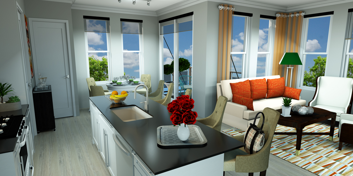 Residences feature open floor plans with nine-foot ceilings, gourmet kitchens with eat-in peninsulas, stainless steel appliances, quartz countertops in kitchens and baths, engineered wood floors in living areas, 42-inch cabinetry and designer bath fixtures, including rain shower heads. The ninth floor penthouse units offer 10-foot ceilings, as well as other premium features including a Bosch appliance package and upgraded finishes and fixtures. All homes have private outdoor terraces or balconies and in-unit washers and dryers.
