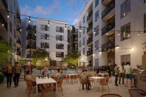 Tempo Nine Mile Station Exterior Amenities Rendering: An outdoor pool and landscaped courtyard are among Tempo Nine Mile Station’s many exterior resident amenities.
