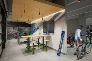 Tempo Nine Mile Station Interior Amenities Rendering: Tempo Nine Mile Station’s robust package of interior amenities include a bike-ski-kayak room, co-working spaces, community room, yoga studio and rooftop fitness center.