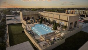 Josephine Rooftop Pool Aerial: The Josephine’s expansive rooftop recreation deck boasts a glass-walled pool with private cabanas, outdoor kitchens with gourmet grilling stations, and an outdoor yoga studio.