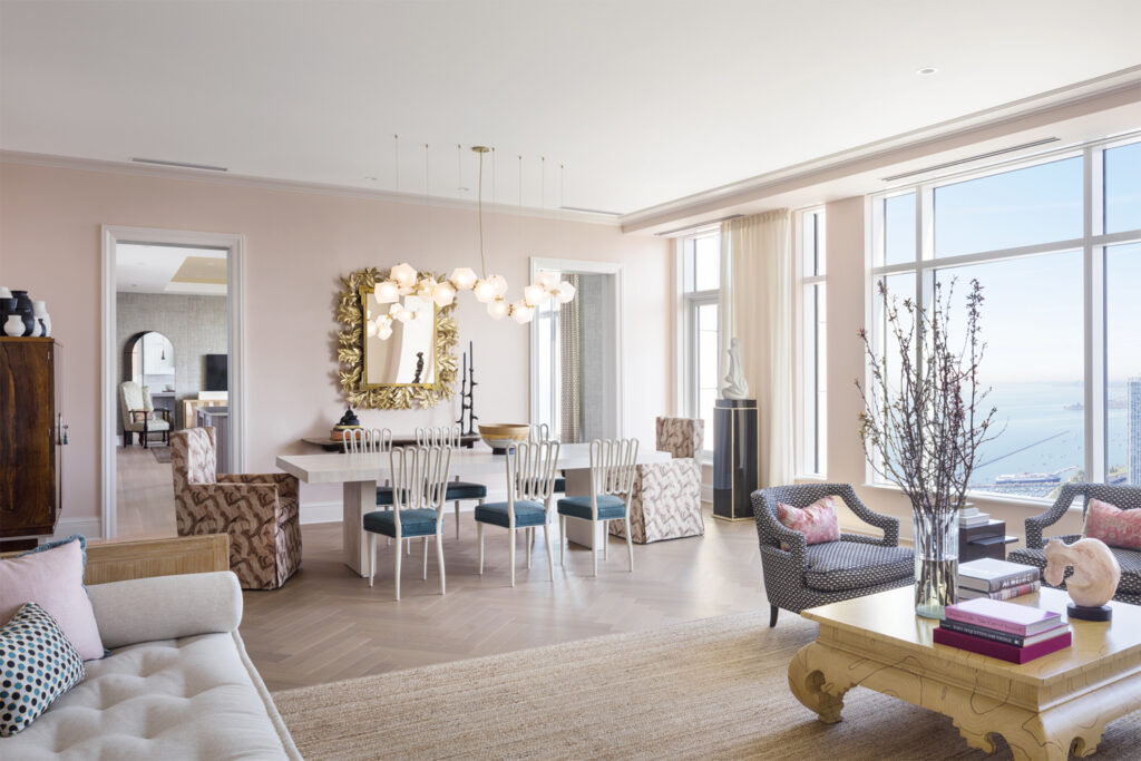With decor by Chicago-based Bruce Fox Design, the living and dining room of residence 5106 features warm blush-colored walls, antiques, bespoke furniture and oversized windows looking out to Lake Michigan and the skyline.