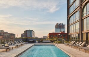 Related Midwest_The Row Fulton Market_Pool Deck: The Row Fulton Market offers residents more than 22,000 square feet of indoor and outdoor amenities, including a lap pool with lounge seating flanked by outdoor grilling areas and fire pits overlooking the surrounding cityscape. (Credit: Tom Harris)