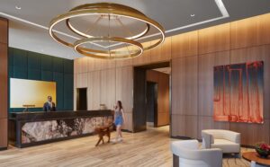 Related Midwest_The Row Fulton Market_Residential Lobby: Designed by MAWD, the lobby at The Row Fulton Market is home to a 24-hour concierge desk as well as notable design elements including an oversized custom chandelier, midcentury modern-inspired wall coverings and museum-quality works of art from artists Robert Janitz and Pieter Vermeersch. (Credit: Tom Harris)