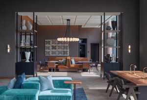 The Row’s interiors were created by MAWD (March and White Design), which incorporated mid-century architectural references, rich textures and warm color palettes across the residences and common areas, such as the building’s welcoming fireplace lobby that pairs stained wood paneling with green suede wallcoverings, as well as the entertainment spaces, which are infused with bronze-hued metals, herringbone-patterned flooring and custom light fixtures. The MAWD team took a hospitality-inspired approach to give The Row a private club feel while maximizing indoor-outdoor connections.